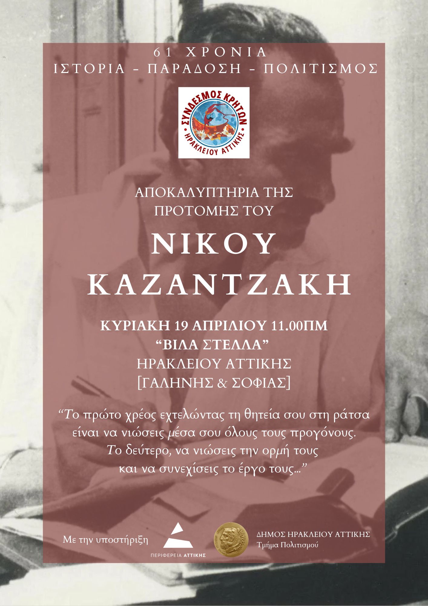 Ο Σύνδεσμος Κρητών της πόλης, με την υποστήριξη του Δήμου, πραγματοποιεί τα αποκαλυπτήρια της προτομής του μεγάλου Έλληνα λογοτέχνη την Κυριακή 19 Απριλίου στις 11.00 το πρωί στην αυλή της Βίλα Στέλλα (Γαλήνης και Σοφίας) σε μια εκδήλωση - αφιέρωμα στο Νίκο Καζαντζάκη που θα συνοδευτεί από κρητικά κεράσματα.