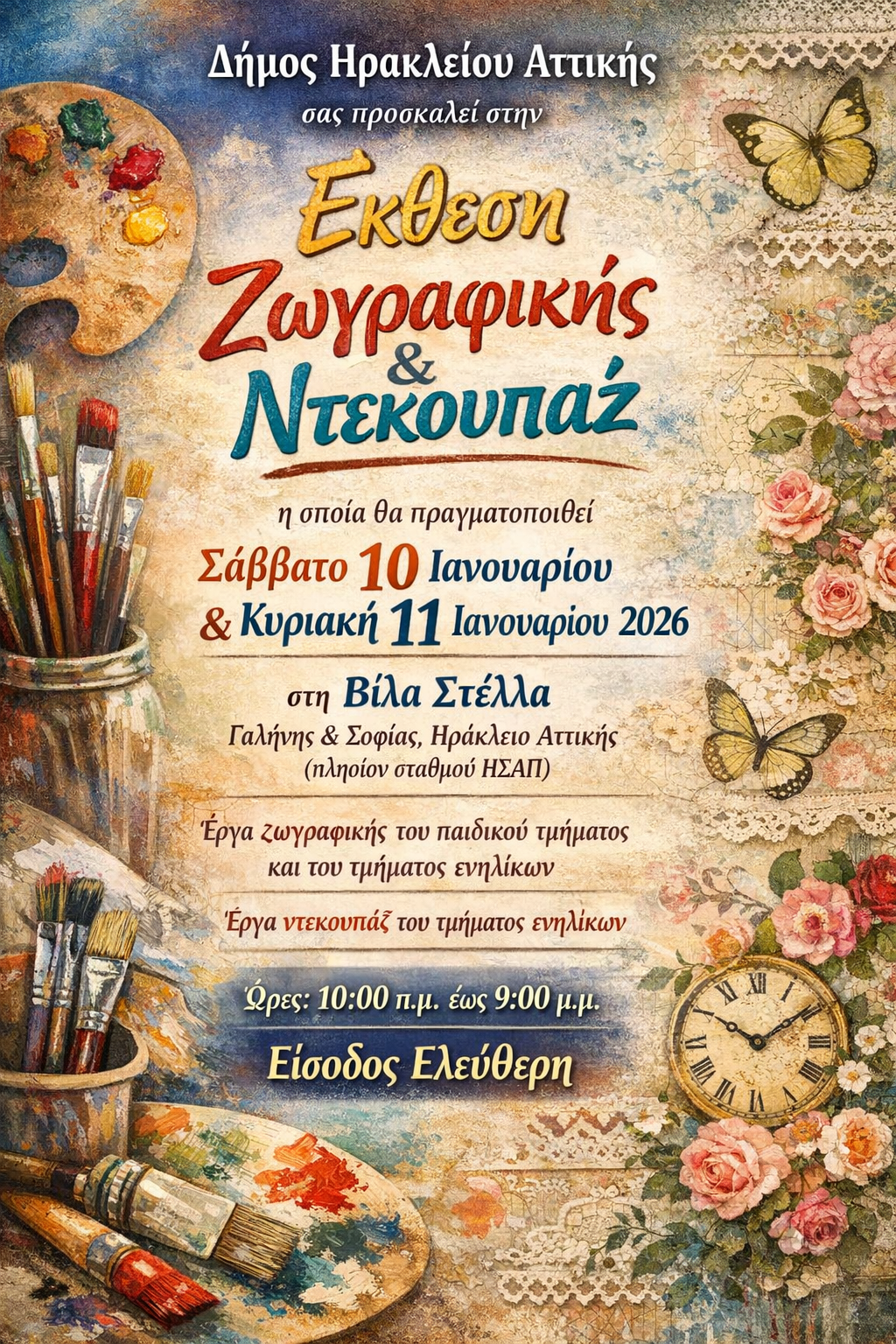 Καλλιτεχνικά ξεκινάει η χρονιά στον Δήμο Ηρακλείου Αττικής. Οι μαθητές και οι μαθήτριες των τμημάτων Δημιουργικής και Καλλιτεχνικής Απασχόλησης που διοργανώνει ο Δήμος μέσα από την δημοτική του επιχείρηση ΚΕΑΕΔΗΑ παρουσιάζουν τις δημιουργίες τους στην ζωγραφική και το ντεκουπάζ σε μια έκθεση που θα φιλοξενηθεί αυτό το Σαββατοκύριακο 10 και 11 Ιανουαρίου στον πολιτιστικό χώρο της Βίλα Στέλλα (Γαλήνης και Σοφίας, Ηράκλειο Αττικής).
