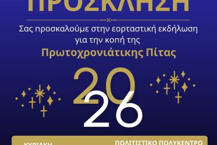 Ο Δήμος κόβει την πρωτοχρονιάτικη πίτα του και καλεί τους δημότες την Κυριακή 1 Φεβρουαρίου στις 11.00 το πρωί στο Πολιτιστικό Πολύκεντρο "Ηλέκτρα Αποστόλου" για ανταλλαγή ευχών και απόψεων.