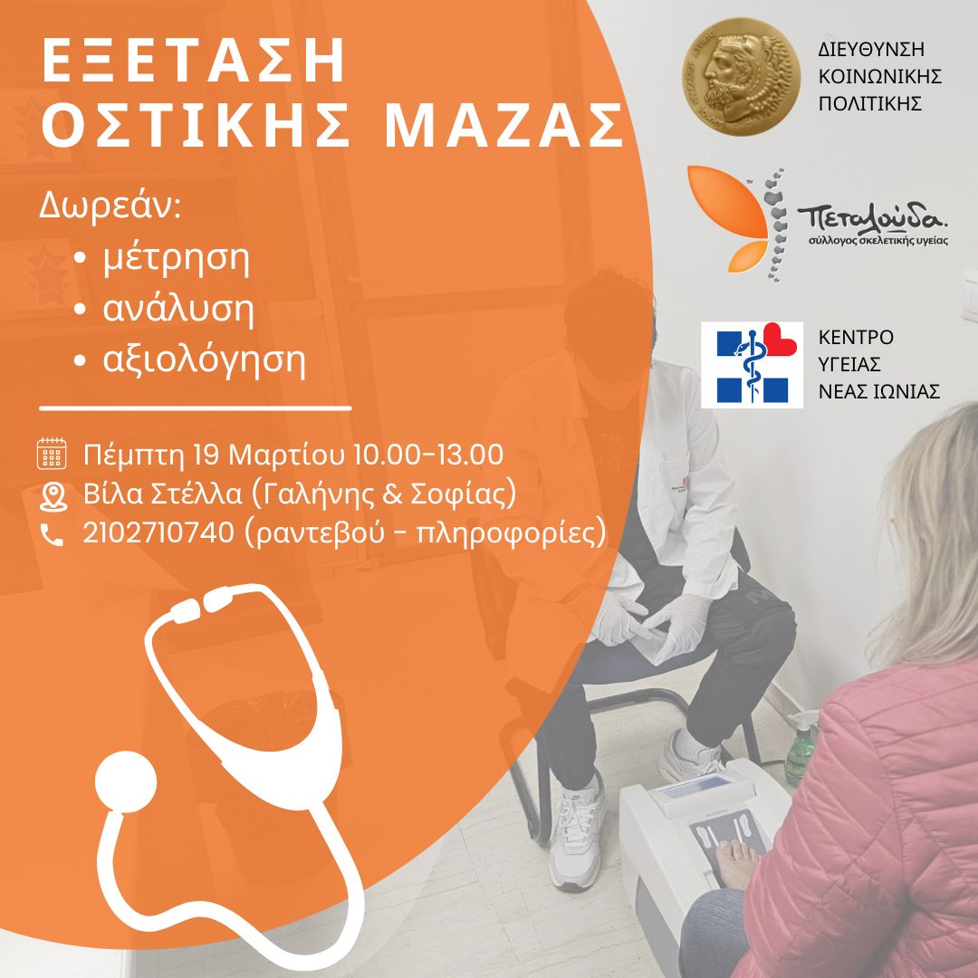 Την επιτυχημένη δράση προληπτικού ελέγχου και ενημέρωσης για την οστεοπόρωση επαναλαμβάνει ο Δήμος Ηρακλείου Αττικής ώστε να δώσει την ευκαιρία σε ακόμα περισσότερους πολίτες να επωφεληθούν. Όπως πάντα, η πρωτοβουλία περιλαμβάνει δωρεάν μέτρηση, έλεγχο και αξιολόγηση οστικής πυκνότητας σε μια συνεργασία της Διεύθυνσης Κοινωνικής Πολιτικής του Δήμου, με τον Σύλλογο Σκελετικής Υγείας Πεταλούδα και το επιστημονικό προσωπικό του Κέντρου Υγείας Νέας Ιωνίας. Οι νέες μετρήσεις θα γίνουν την Πέμπτη 19 Μαρτίου από τις 10.00 το πρωί έως τις 13.00 το μεσημέρι στον χώρο της Βίλα Στέλλα (Γαλήνης και Σοφίας).