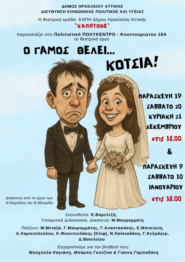 Την παράσταση «Ο Γάμος θέλει κότσια» ανεβάζει η θεατρική ομάδα των ΚΑΠΗ του Δήμου Ηρακλείου Αττικής μέσα στην περίοδο των γιορτών. Στο θέατρο του Πολιτιστικού Πολύκεντρου «Ηλέκτρα Αποστόλου» (Κουντουριώτου & Νεότητος), 19 - 21 Δεκεμβρίου και 9 – 10 Ιανουαρίου του νέου έτους, με κοινή ώρα έναρξης στις 18.00 το απόγευμα, οι ερασιτέχνες ηθοποιοί μέλη των δημοτικών ΚΑΠΗ θα παίξουν μια διασκευή του γνωστού έργου των Ν. Καμπάνη και Β. Μαυρίδη, υπό την καθοδήγηση της σκηνοθέτιδας και δασκάλας της ομάδας, Μ. Μαυρομμάτη.