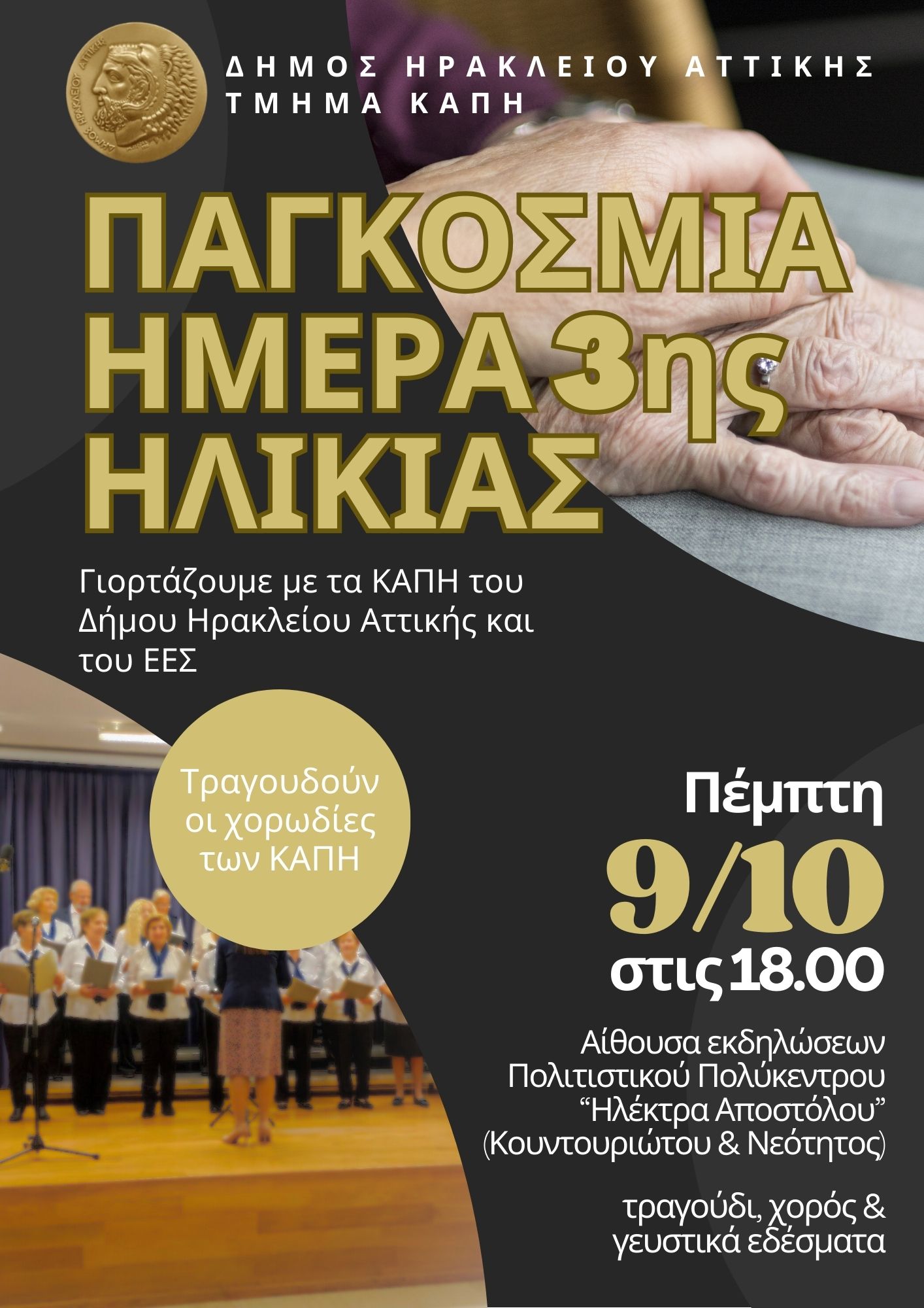 Την Παγκόσμια Ημέρας Τρίτης Ηλικίας τιμούν και γιορτάζουν τα μέλη των ΚΑΠΗ του Δήμου Ηρακλείου Αττικής με την καθιερωμένη, πλέον, εκδήλωση που πραγματοποιούν κάθε χρόνο τέτοια εποχή.