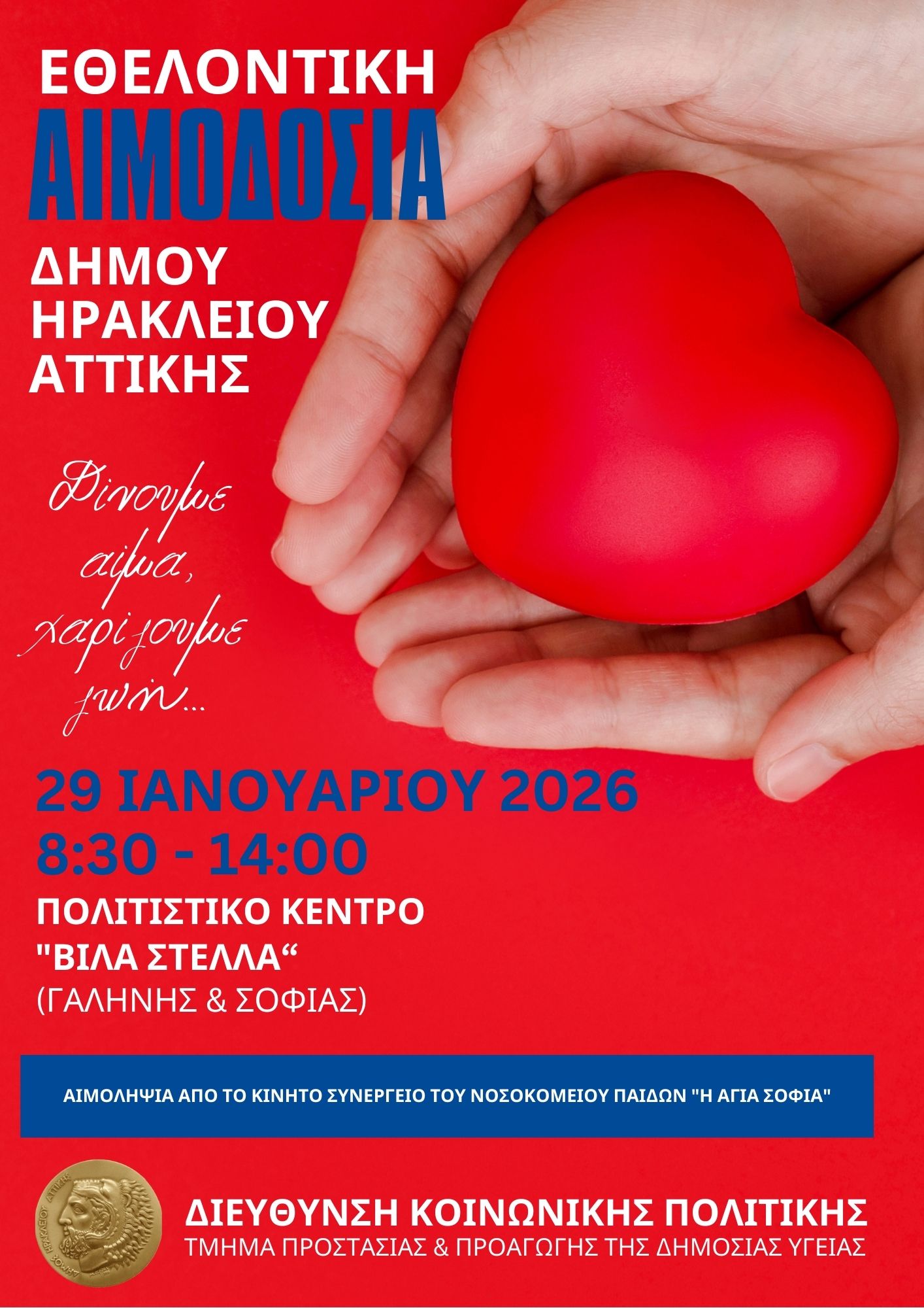Μπορεί τα Χριστούγεννα να είναι η «επίσημη» εποχή ανταλλαγής δώρων, όμως για το καλύτερο και, ταυτόχρονα, μεγαλύτερο δώρο που μπορεί να κάνει ο καθένας και η κάθε μία από εμάς υπάρχει ακόμα χρόνος. Ο Δήμος Ηρακλείου Αττικής οργανώνει την καθιερωμένη, χειμερινή του εθελοντική αιμοδοσία και καλεί, όσες και όσους θέλουν να προσφέρουν, την Πέμπτη 29 Ιανουαρίου από τις 8.30 έως τις 14.00, στο δημοτικό πολιτιστικό κέντρο, Βίλα Στέλλα (Γαλήνης και Σοφίας).