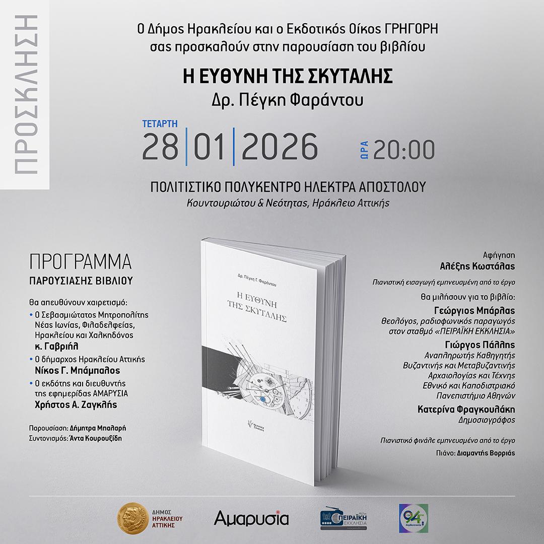 Την παρουσίαση του βιβλίου της δρ. Πέγκης Φαράντου «Η Ευθύνη της Σκυτάλης» φιλοξενεί ο Δήμος Ηρακλείου Αττικής την Τετάρτη 28 Ιανουαρίου στις 20.00 το βράδυ στην κεντρική αίθουσα του Πολιτιστικού Πολύκεντρου «Ηλέκτρα Αποστόλου» (Κουντουριώτου και Νεότητος, Ηράκλειο Αττικής)