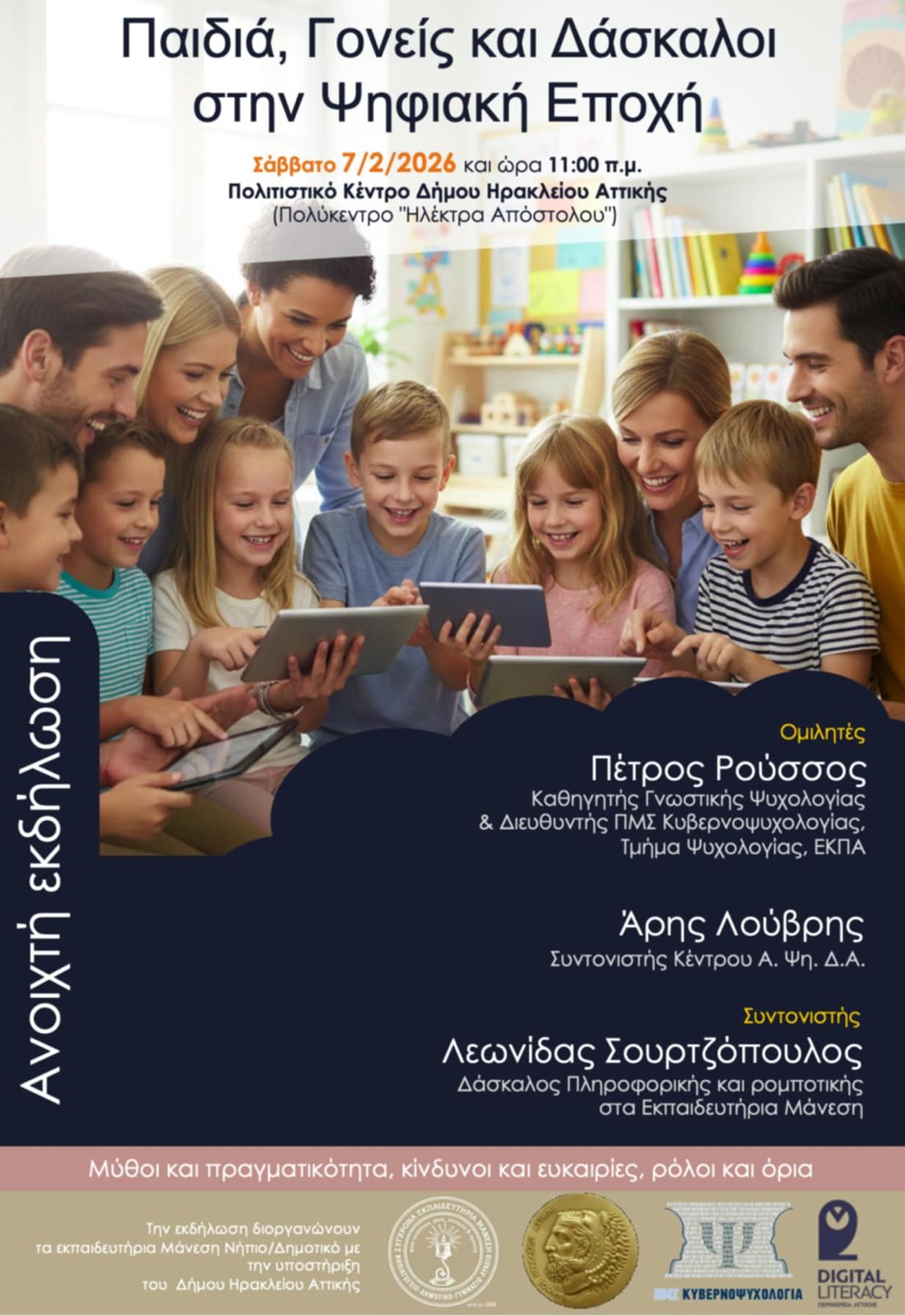 Το επίκαιρο θέμα της χρήσης της τεχνολογίας στην καθημερινότητα μιας οικογένειας και πώς αυτή επηρεάζει τα παιδιά, τους γονείς αλλά και την σχέση με το σχολείο αναλύουν ειδικοί σε μια άκρως ενδιαφέρουσα ημερίδα που διοργανώνουν ο Δήμος Ηρακλείου Αττικής και τα Εκπαιδευτήρια Μάνεση, το Σάββατο 7 Φεβρουαρίου στις 10.30πμ στο δημοτικό Πολιτιστικό Πολύκεντρο «Ηλέκτρα Αποστόλου» (Κουντουριώτου και Νεότητος) με ελεύθερη, φυσικά, είσοδο.