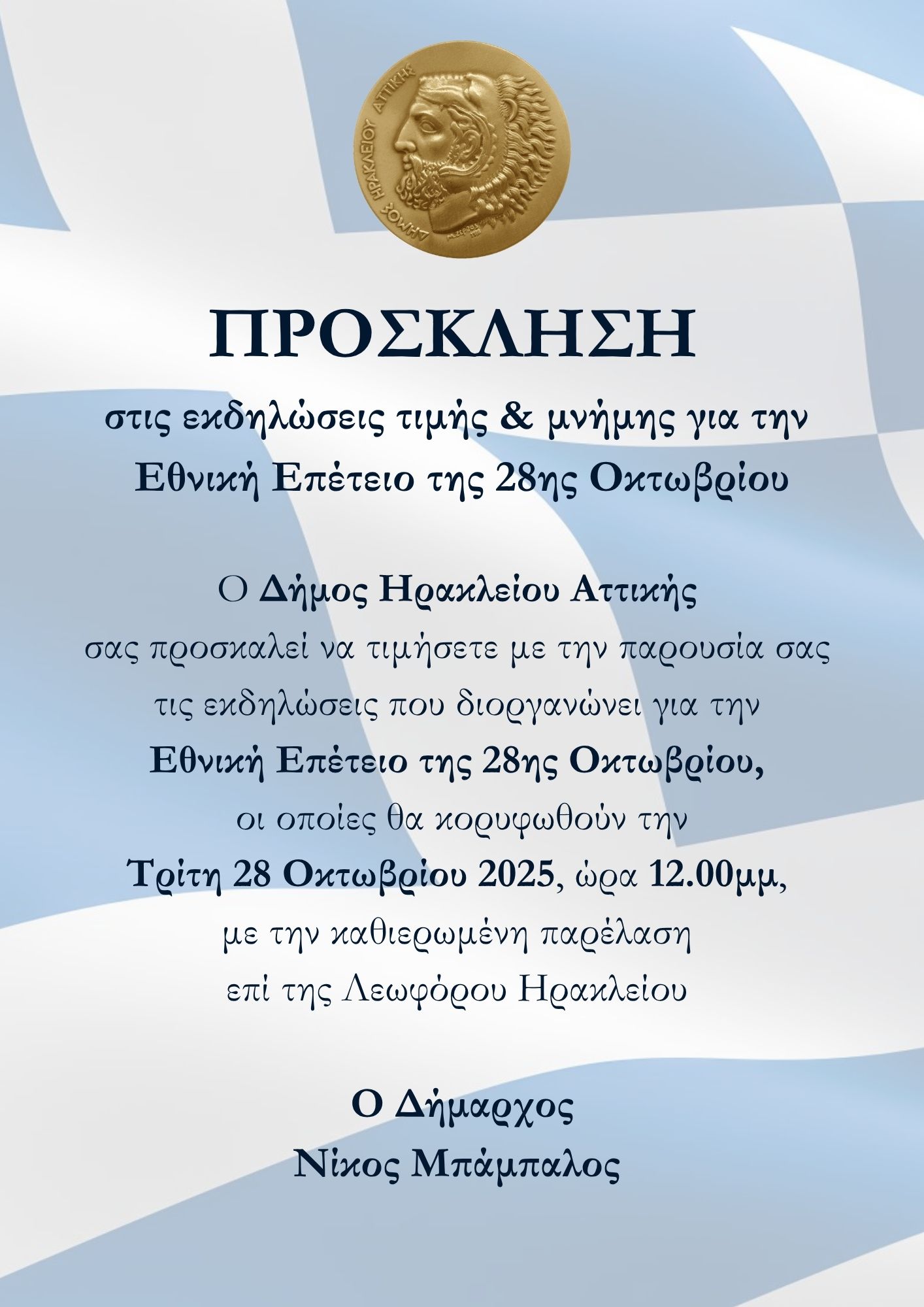 Ο Δήμος Ηρακλείου Αττικής και οι δημότες του γιορτάζουν την φετινή ημέρα της Εθνικής Επετείου της 28ης Οκτωβρίου. Η πόλη έχει σημαιοστολιστεί για τις εκδηλώσεις, οι οποίες θα κορυφωθούν ανήμερα της Εθνικής Επετείου με τις καθιερωμένες τιμές: την κατάθεση στεφάνων στο μνημείο της πλατείας Αγίου Λουκά και, φυσικά, την παρέλαση των σχολείων και των συλλόγων της πόλης επί της λεωφόρου Ηρακλείου.