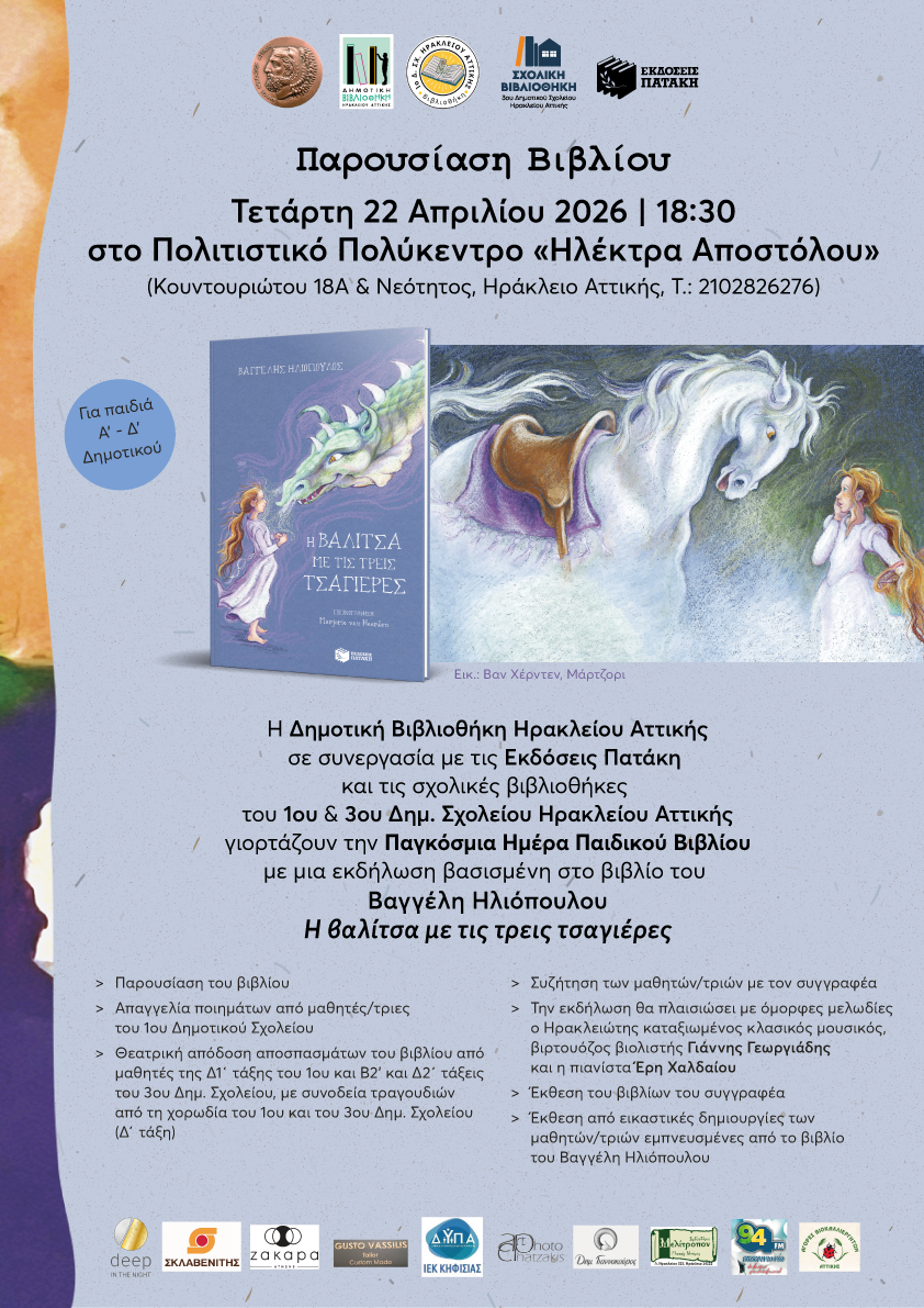 Η εκδήλωση γίνεται σε συνεργασία με τις Εκδόσεις Πατάκη και τις Σχολικές Βιβλιοθήκες του 1ου και του 3ου Δημοτικού Σχολείου Ηρακλείου Αττικής.